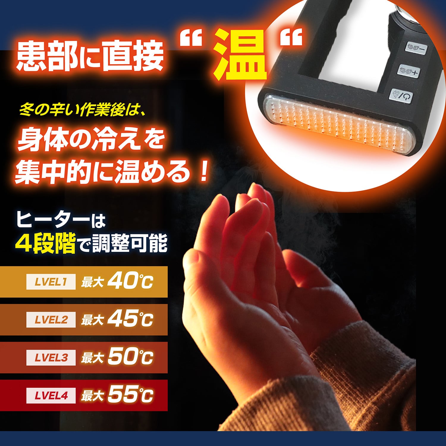 ◇4段階ヒーター…40℃から最大55℃まで約5℃刻みで温め可能です。冷えて体が動きにくい、お腹の調子が良くないときにお使いいただけます。※振動モードから軽く電源ボタンを押すとヒーターモードに切り替わります。